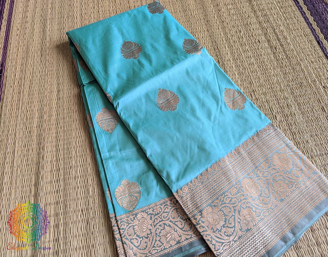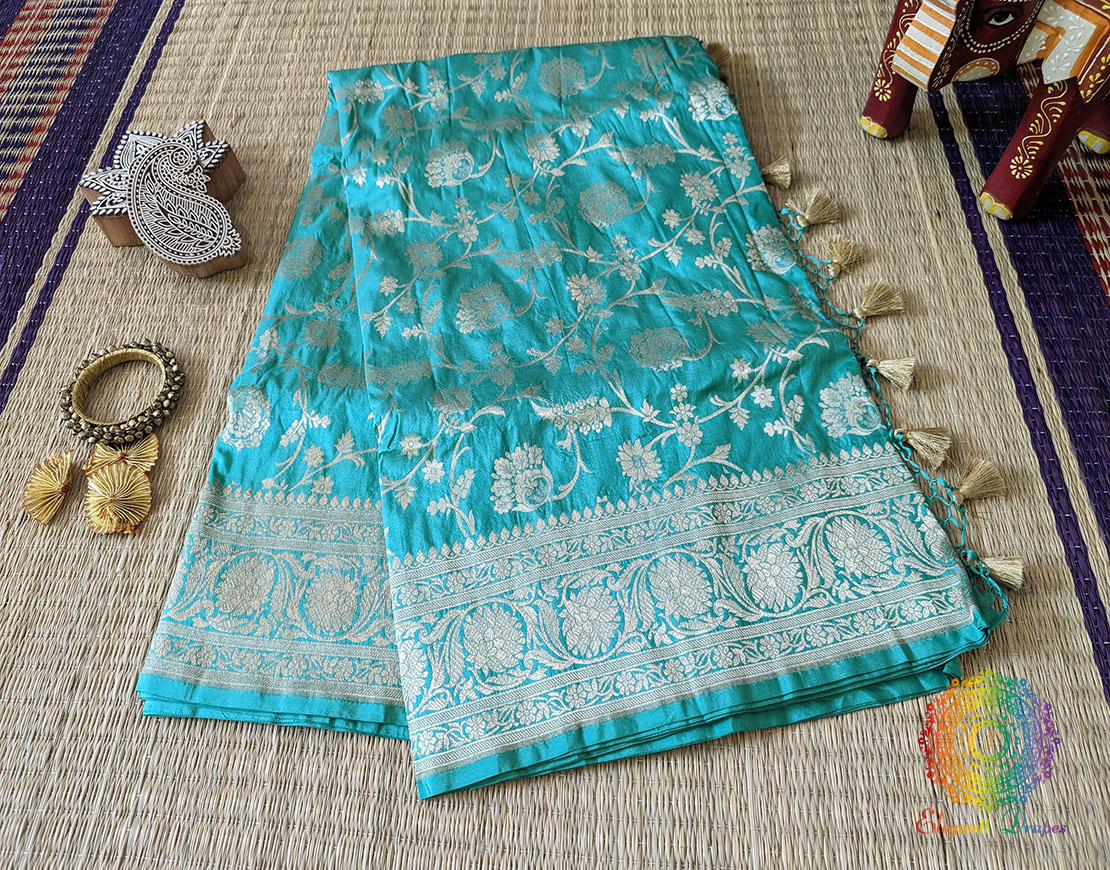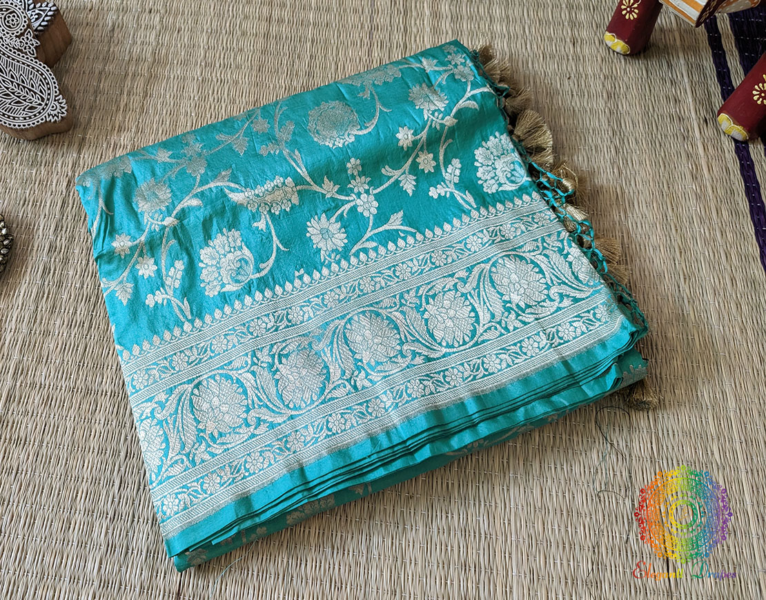 Cyan Pure Banarasi Katan Silk Floral Jaal Saree