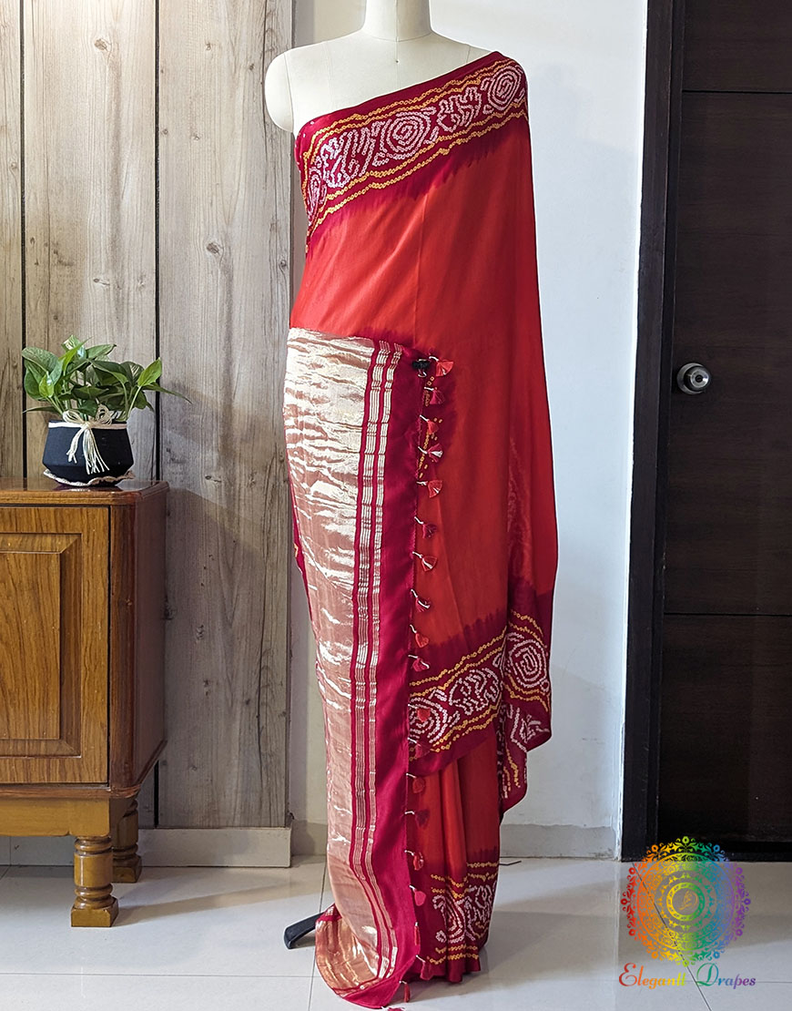 Orange Red Pure Gajji Silk Bandhani Saree
