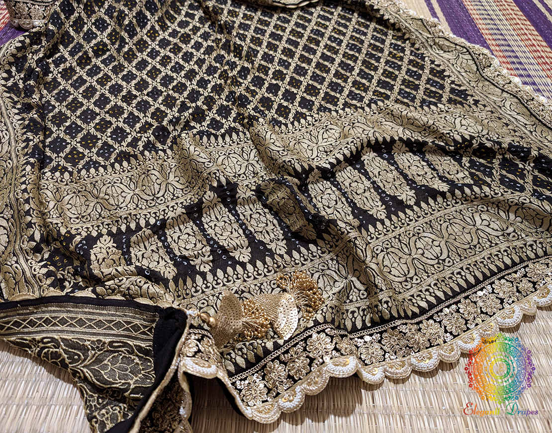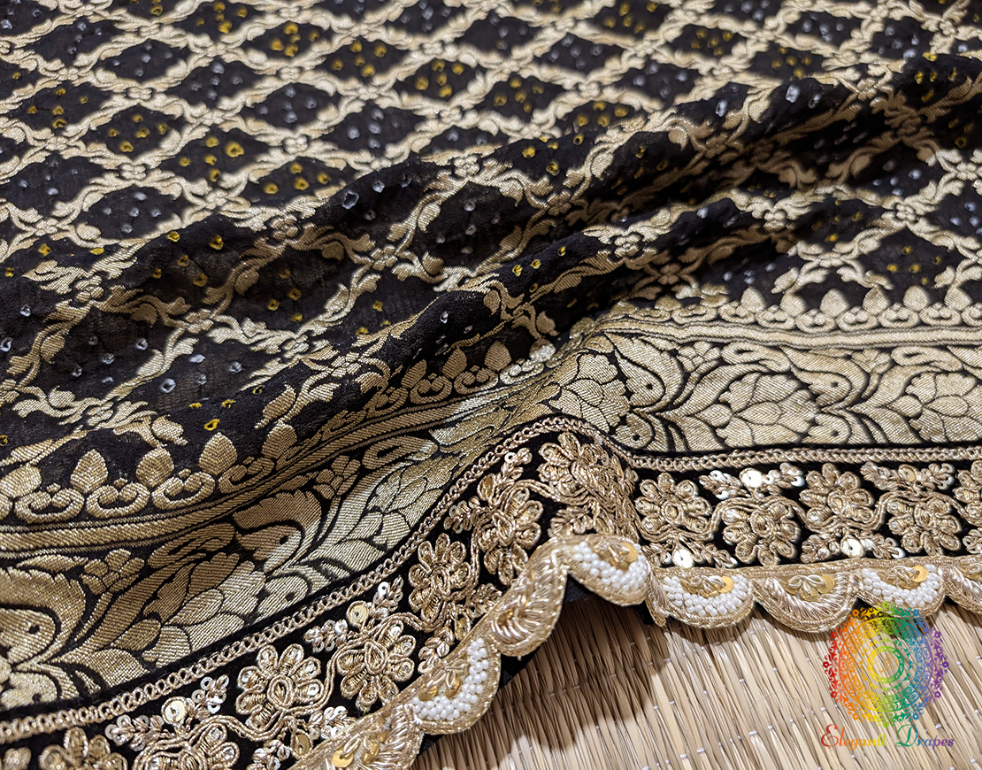 A Lovely Black Banarasi Georgete Bandhani Border Dupatta in Gharchola Pattern. The dupatta is adorned with beautiful marodi, zardozi and mirror work laces on the border.