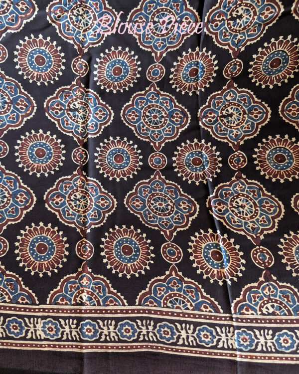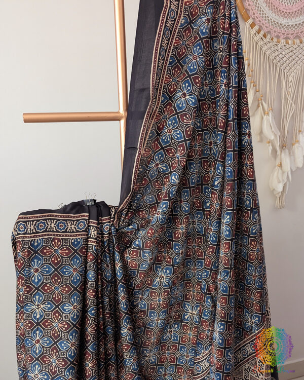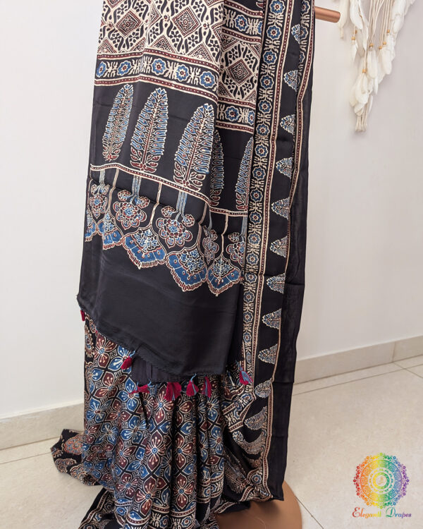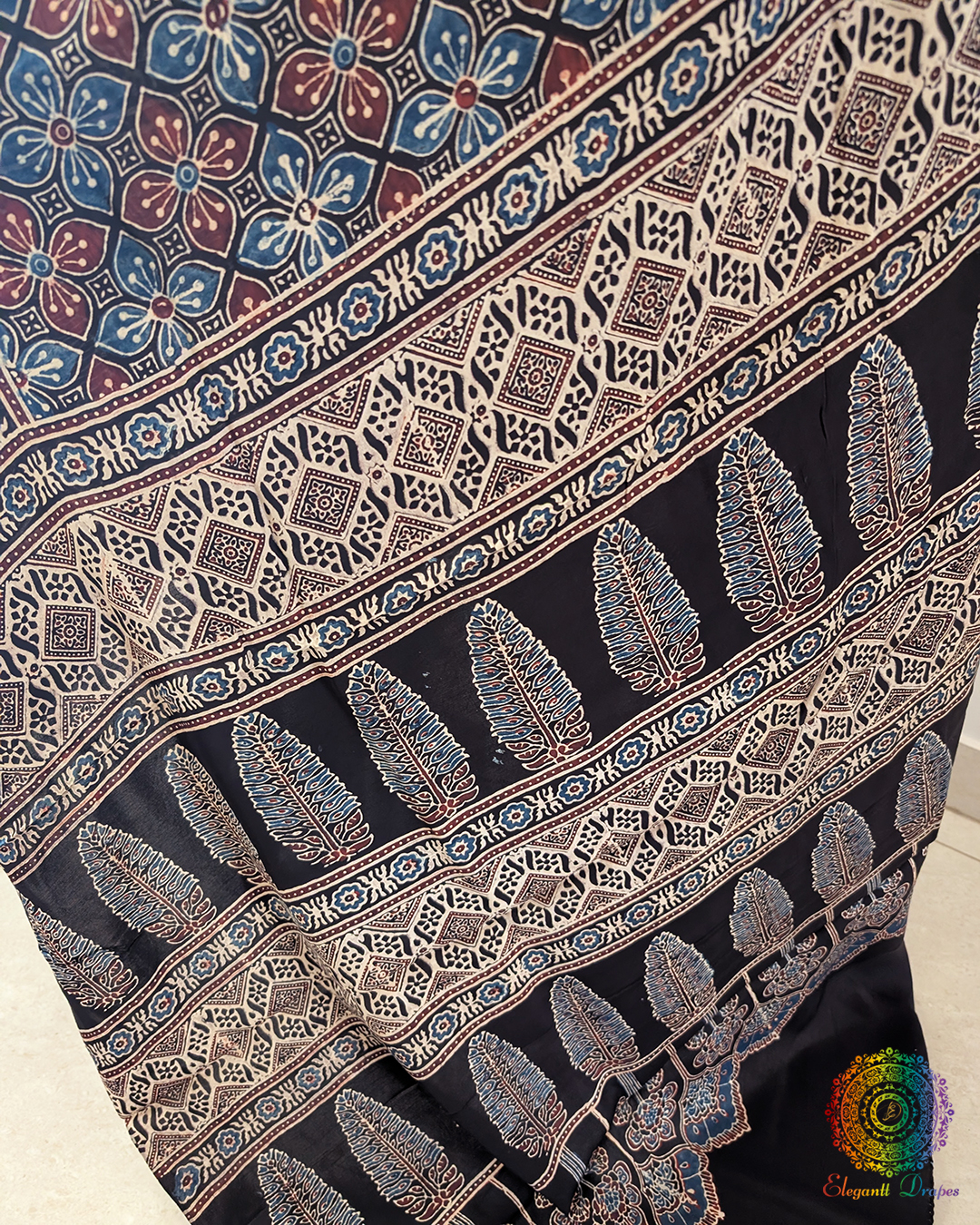 Here we have a Black Modal Silk Ajrakh Saree featuring timeless Ajrakh patterns crafted using traditional block-printing techniques. The pure Modal Silk fabric lends a natural lustre and a rich fall, making it an effortlessly elegant drape for both casual outings and refined occasions. Its organic prints and fluid texture make this saree truly stand out.