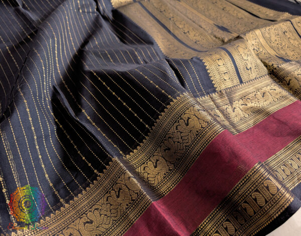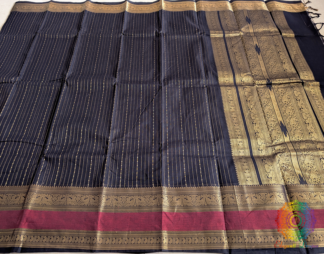 This Black Pure Kanchi Cotton Saree is handwoven in the heritage looms of Tamil Nadu, blending the beauty of simplicity with the richness of South Indian craftsmanship.