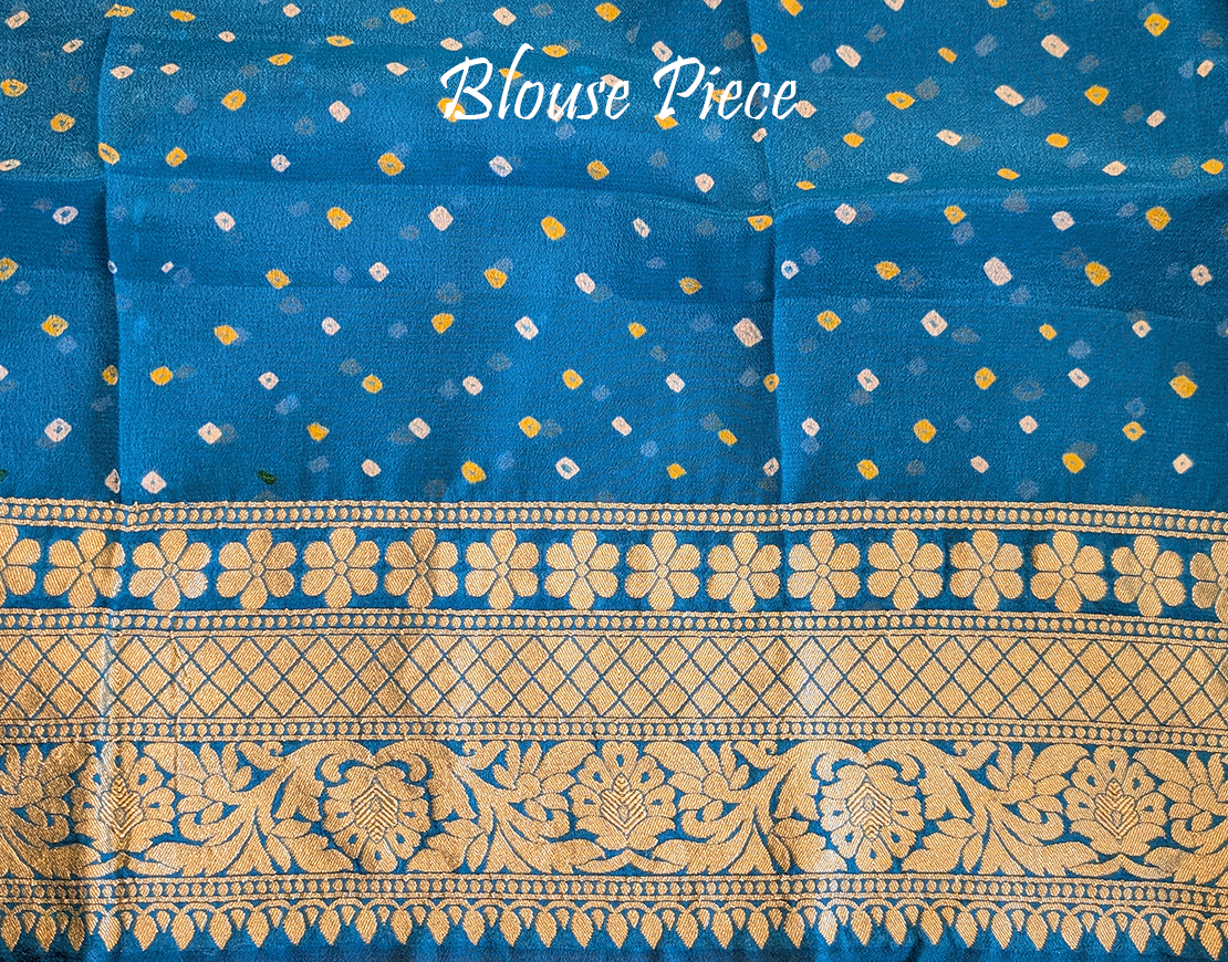 A Lovely Blue Green Shaded Banarasi Bandhani Khaddi Georgette Saree in a beautiful pattern. Its a fusion of karigari from Banaras and Gujarat.