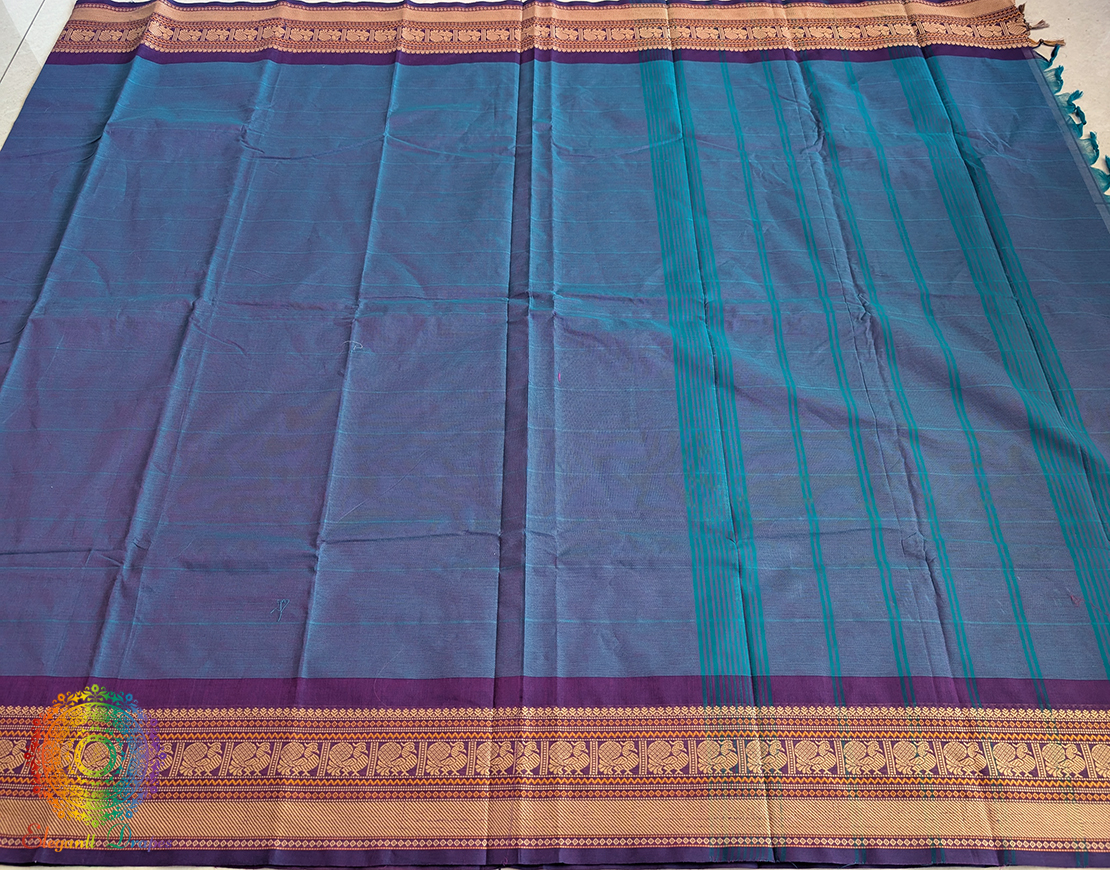 This Blue Pure Kanchi Cotton Saree is handwoven in the heritage looms of Tamil Nadu, blending the beauty of simplicity with the richness of South Indian craftsmanship.
