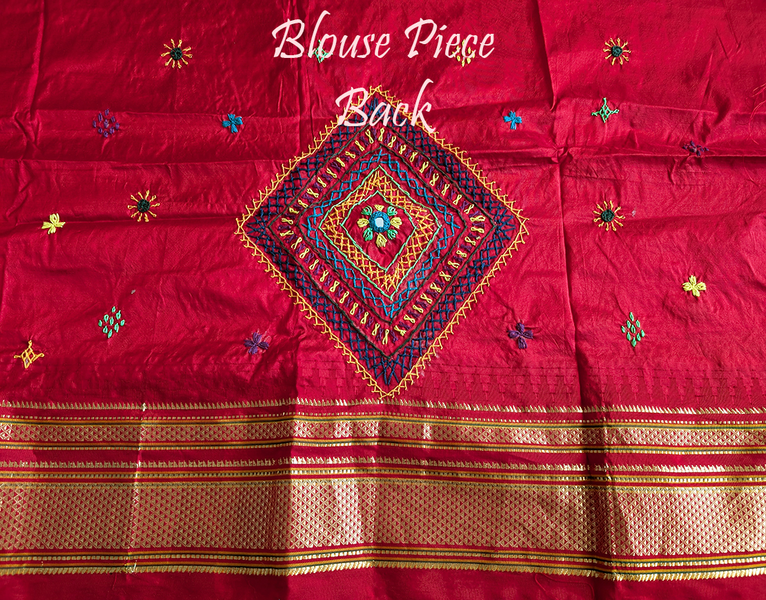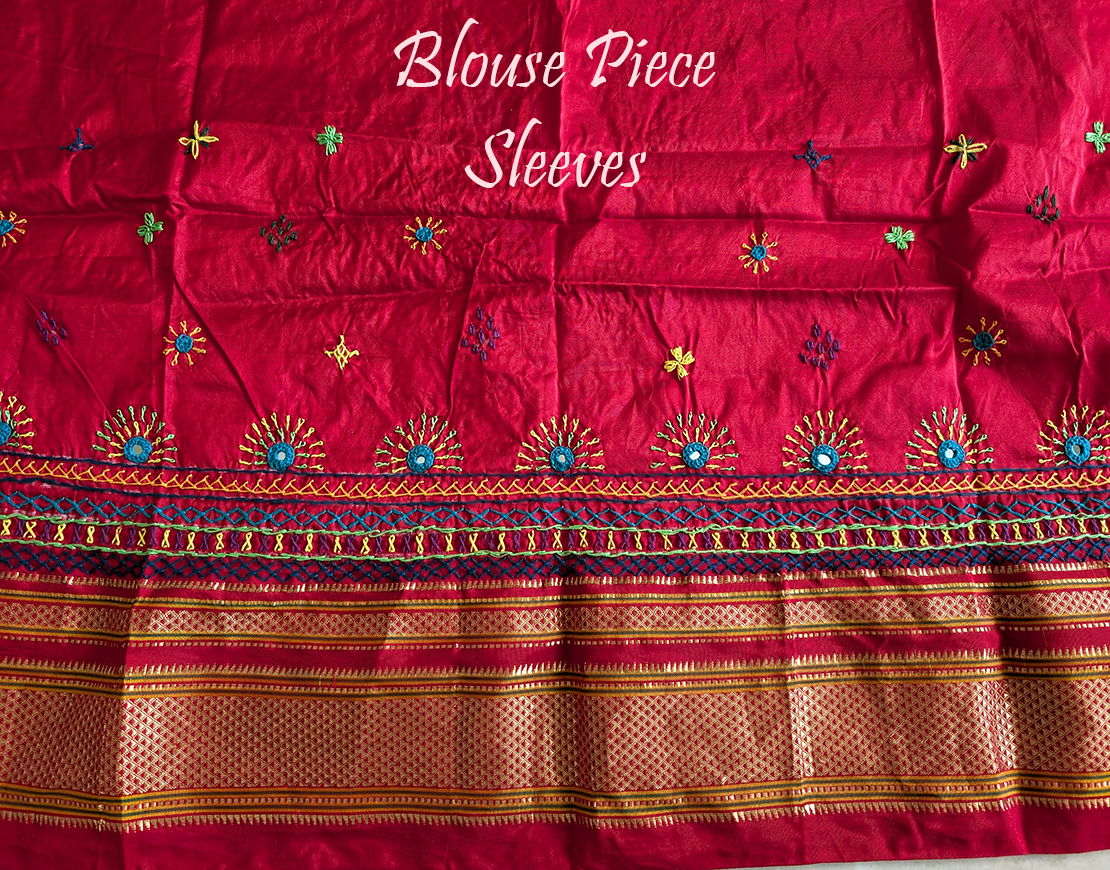 Here we bring a gorgeous Blue Red Lambani Handwork Pure Ilkal Silk Saree. The palla and border are adorned with beautiful Lambani embroidery with colourful threads and mirrors. This Saree comes with embroidered blouse piece.