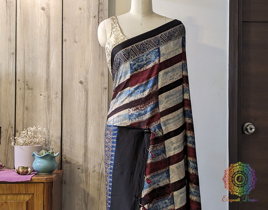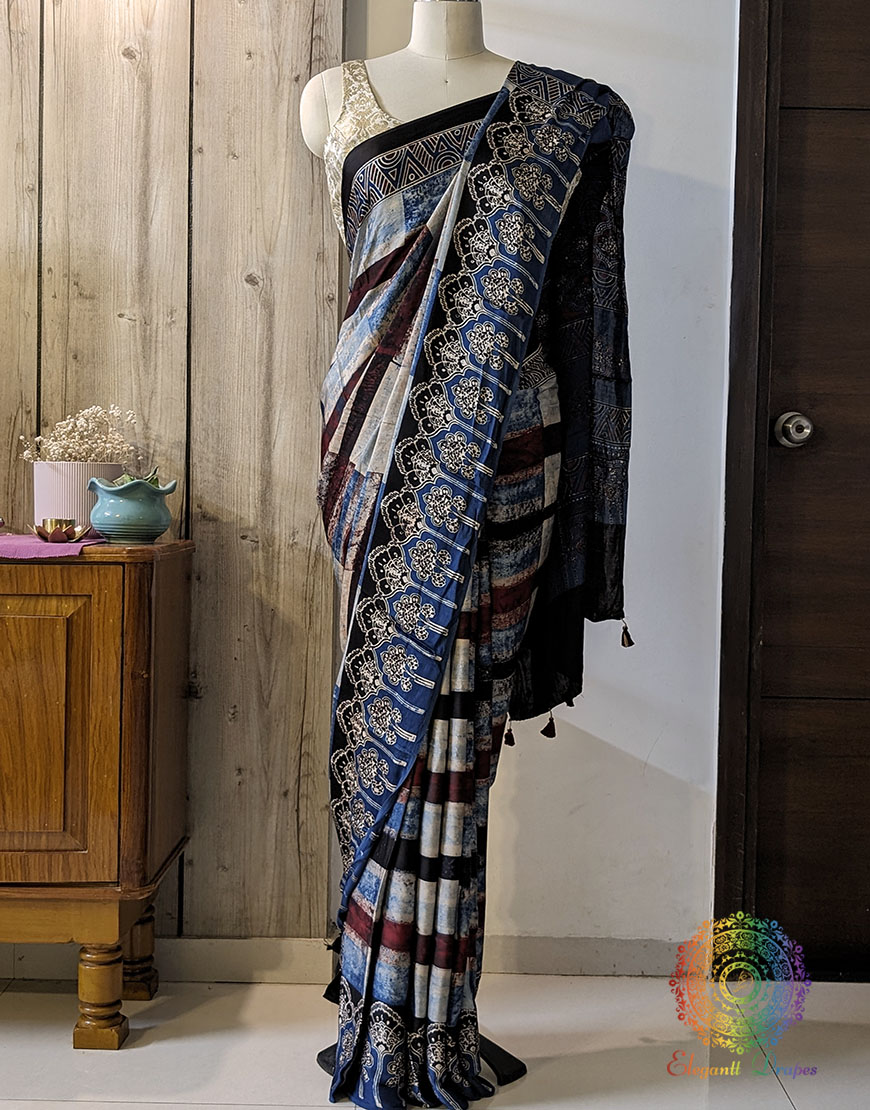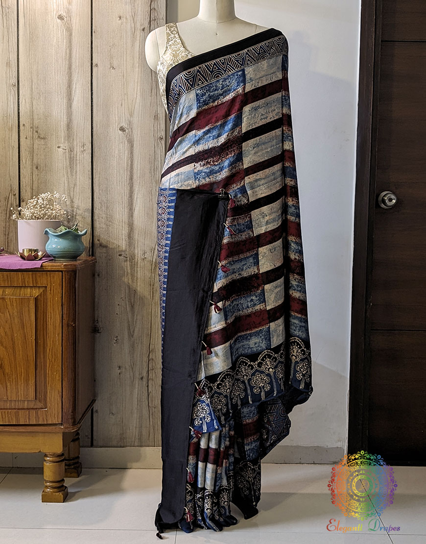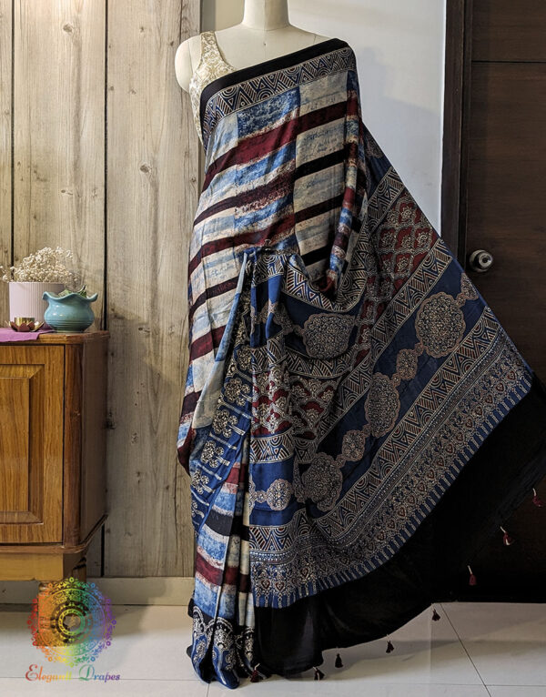 Blue Red Shaded Modal Silk Ajrakh Saree