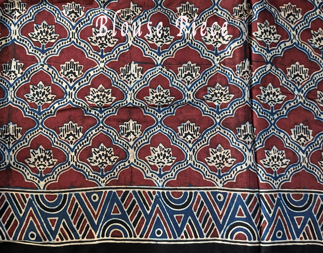 Here we have a Blue Red Shaded Modal Silk Ajrakh Saree in a chic pattern. Moreover, the fabric is pure Modal Silk giving the saree is lustrous and rich look. It’s a very easy to drape saree for a casual wear. Surely the block printing method of Ajrakh saree is unique and makes it stand out.