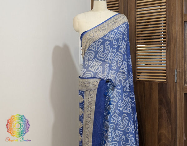 A spectacular Handwoven Blue Shaded Banarasi Pure Georgette Bandhani Saree with golden zari weave. Its a fusion of karigari from Banaras and Kutch.
