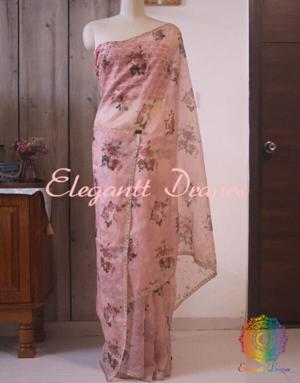 Blush Pink Floral Printed Pure Organza Handwork Saree