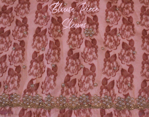 This season, make a style statement in our Organza Collection in beautiful shades. So, Here we have a gorgeous Blush Pink Floral Printed Pure Organza Handwork Saree with beautiful cutdana and pearl handwork all over the border. The fabric is pure Handwoven Organza – light as air. So stand out in a crowd and get loads of compliments in our Organza collection. Furthermore, the saree comes with a pure crepe blouse piece.