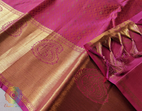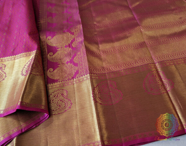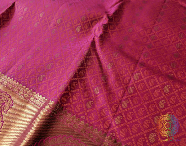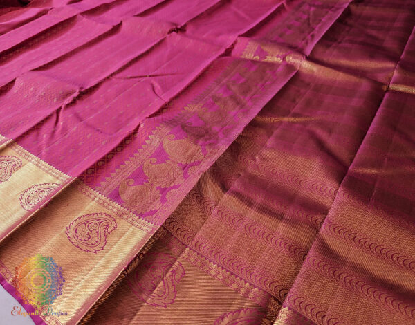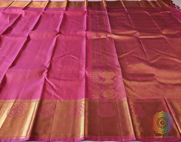 This gorgeous Bridal Pink Pure Kanjivaram Handloom Silk Saree with beautiful pattern all over the body. Also, the border has bootas in golden zari, while the pallu features a geometrical pattern.