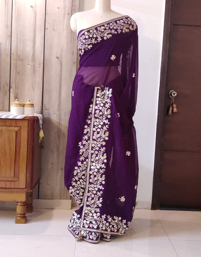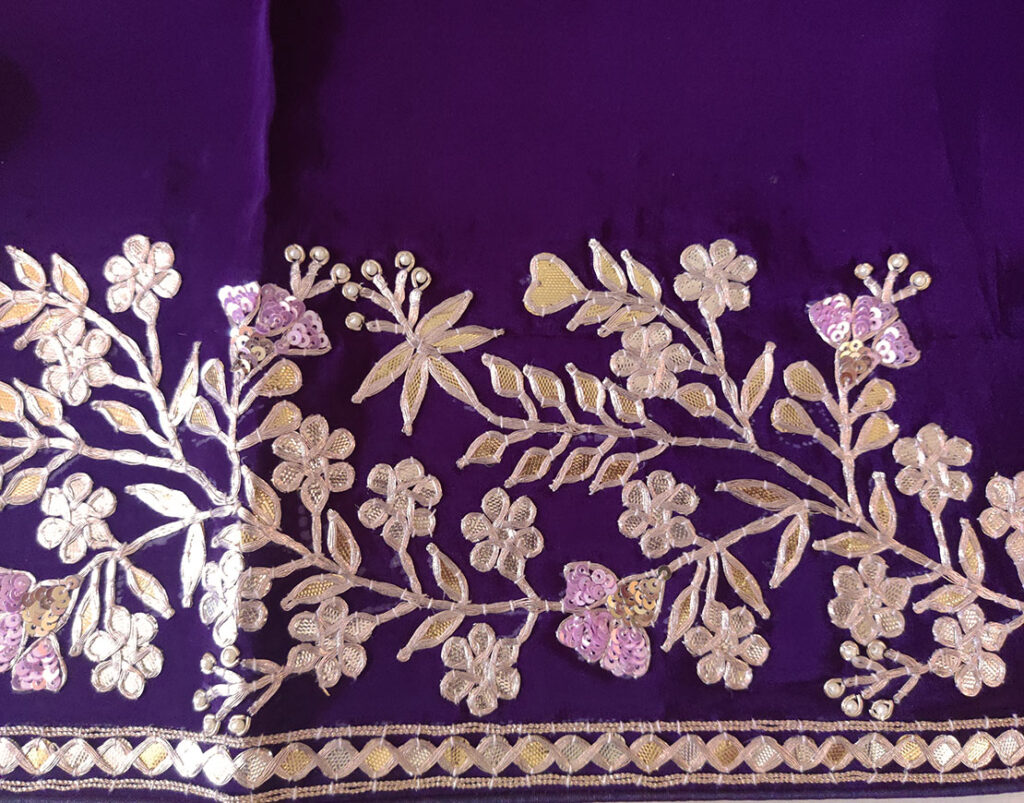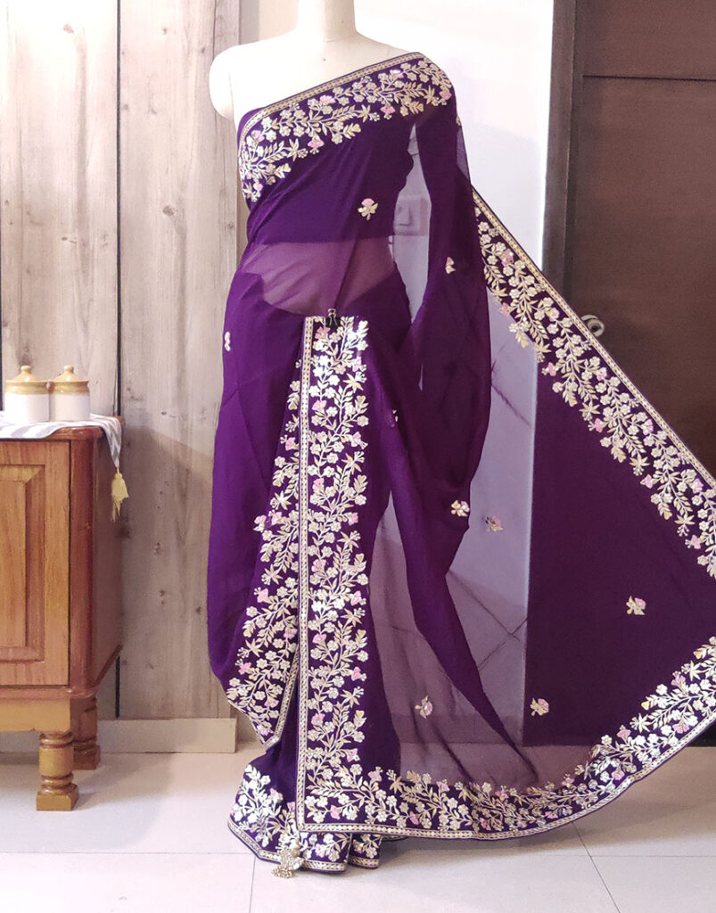 This season, you can make a style statement in our Organza Collection. So, Here is a gorgeous Brinjal Pure Organza Gota Patti Dabka Handwork Saree. Additionally, the border has a fabulous setting of zardozi, gota patti and sequins. Furthermore, the fabric is pure Organza – light as air. Also, the color is simply superb. Also the blouse piece is on pure crepe with work on the sleeves and back.