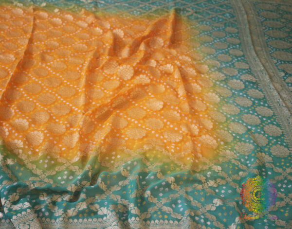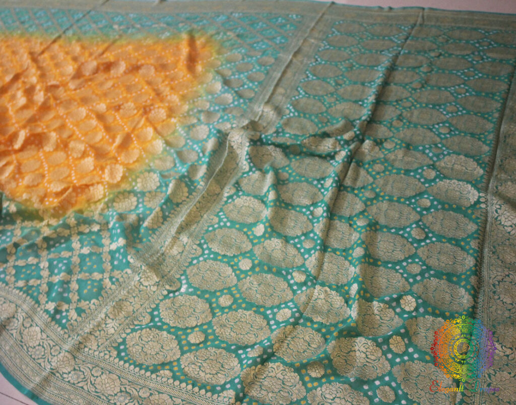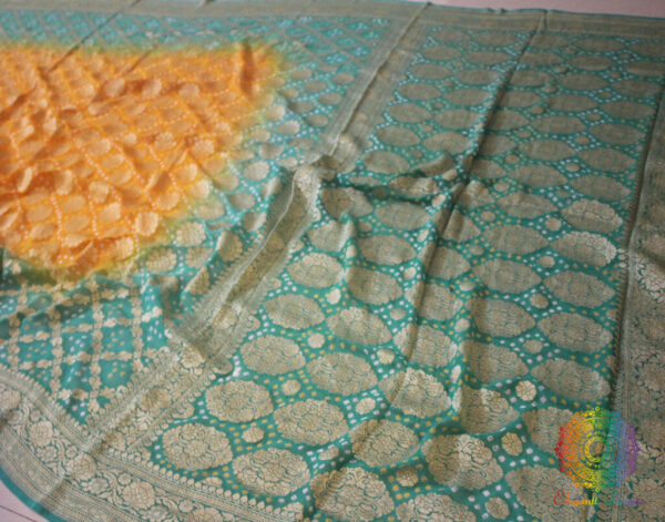 A Beautiful Cyan Mustard Shaded Pure Khaddi Georgette Bandhani Saree in Gharchola Pattern. Its a fusion of karigari from Banaras and Gujarat.