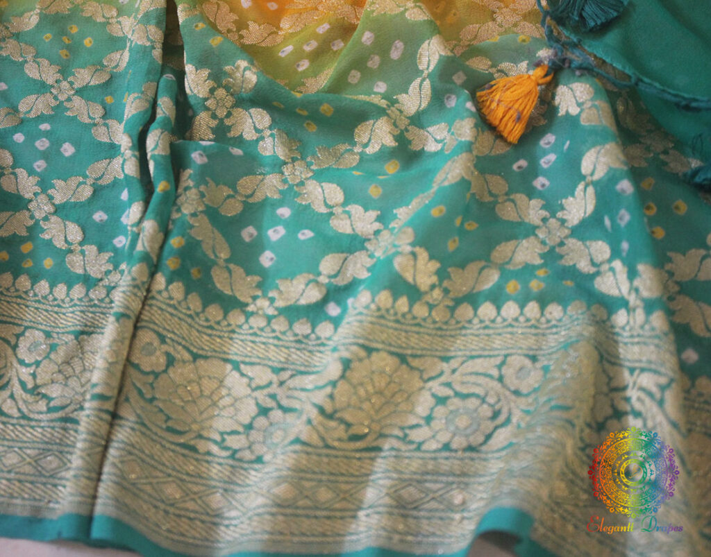 Cyan Mustard Shaded Pure Khaddi Georgette Bandhani Saree