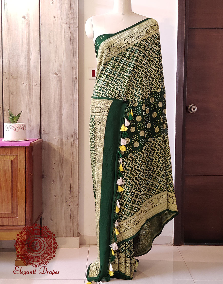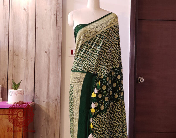 A Lovely Deep Green Pure Banarasi Handloom Georgette Bandhani Saree in Gharchola Pattern. Its a fusion of karigari from Banaras and Gujarat.