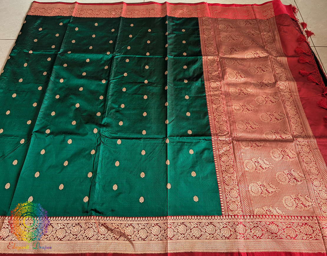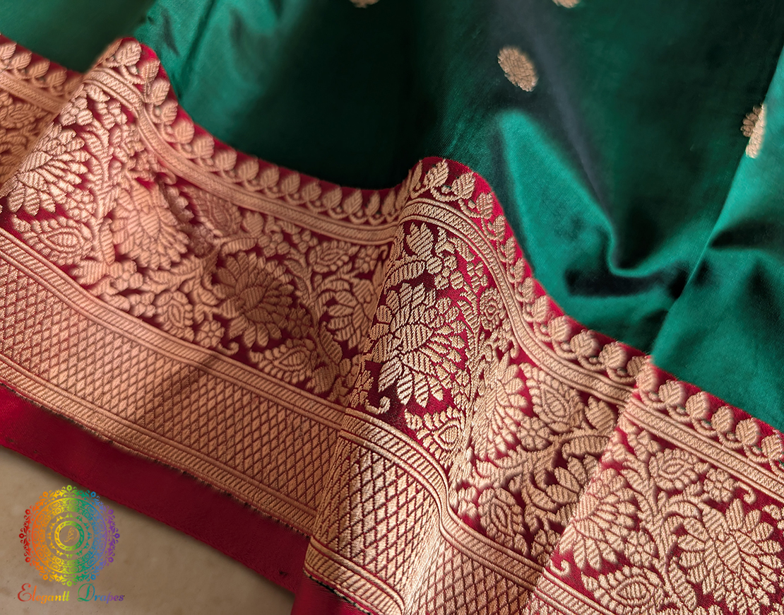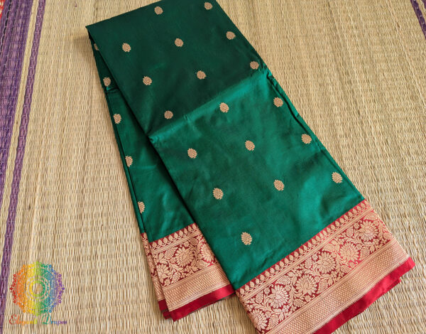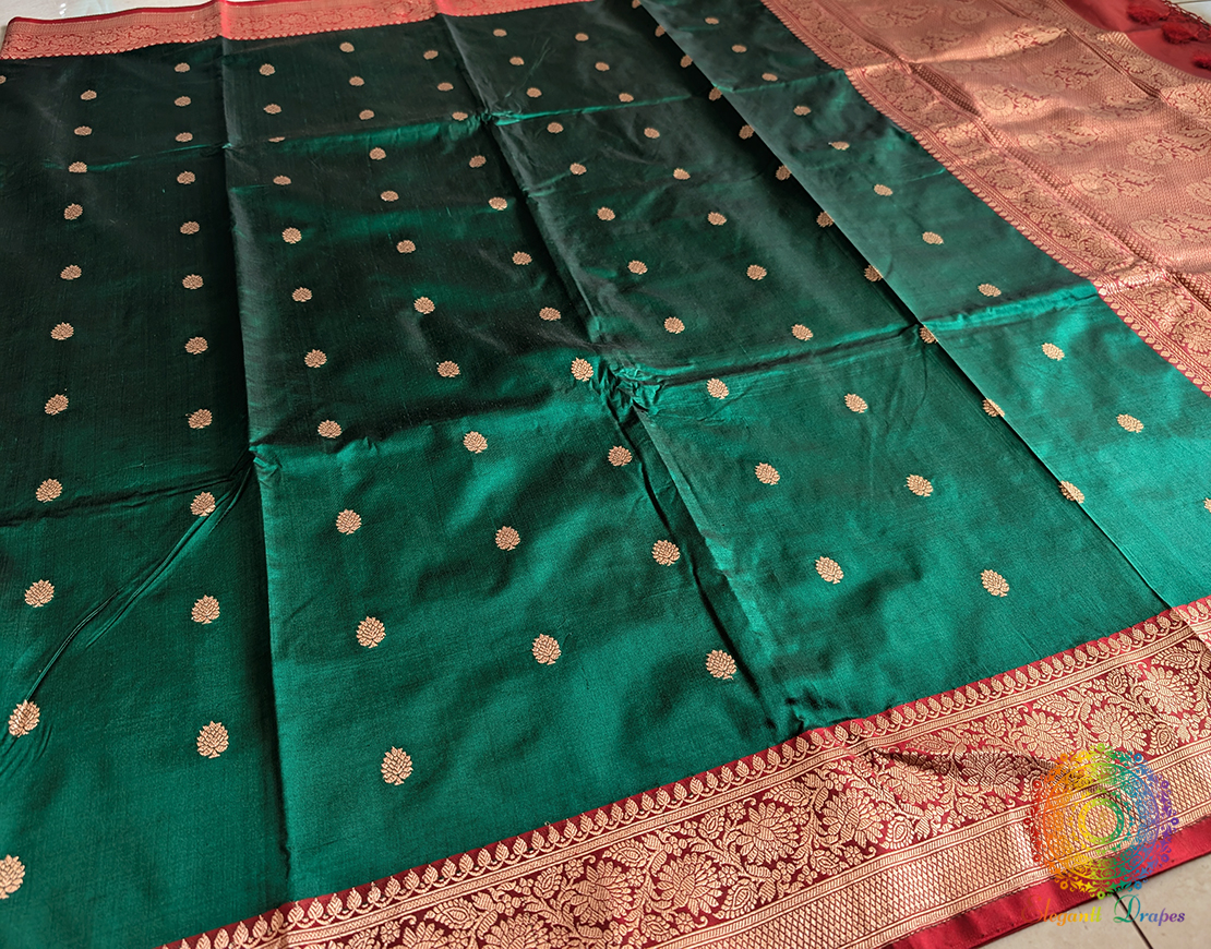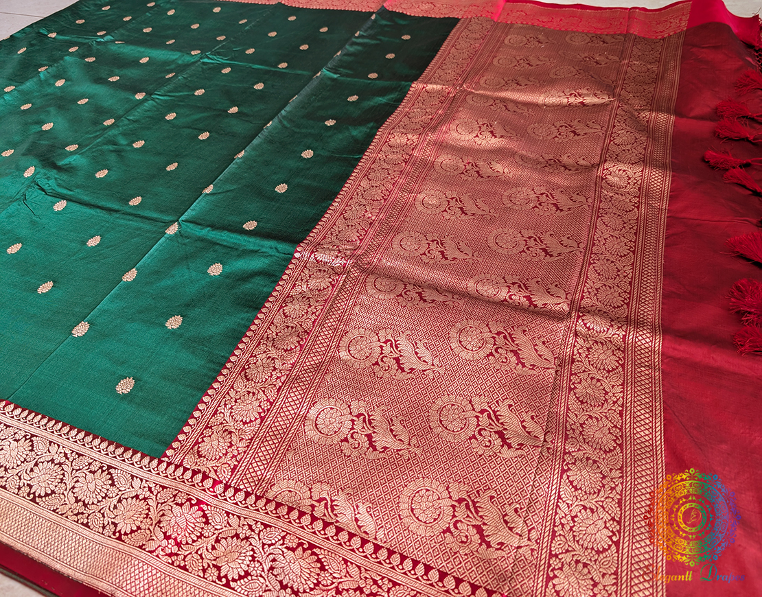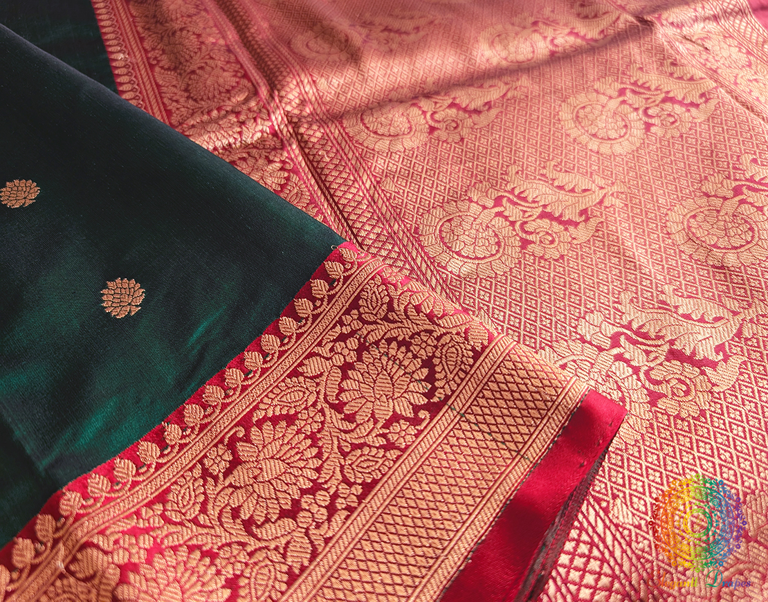 This Green Banarasi Handloom Katan Silk Saree is a statement of elegance and heritage. Woven in pure silk (pattu) with fine zari, the saree radiates luxury while carrying forward centuries-old craftsmanship. This saree highlighted with rich zari work makes it a versatile addition to every woman’s collection — truly a saree not to be missed.