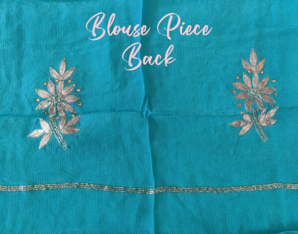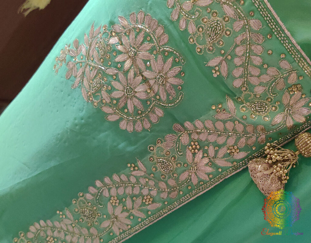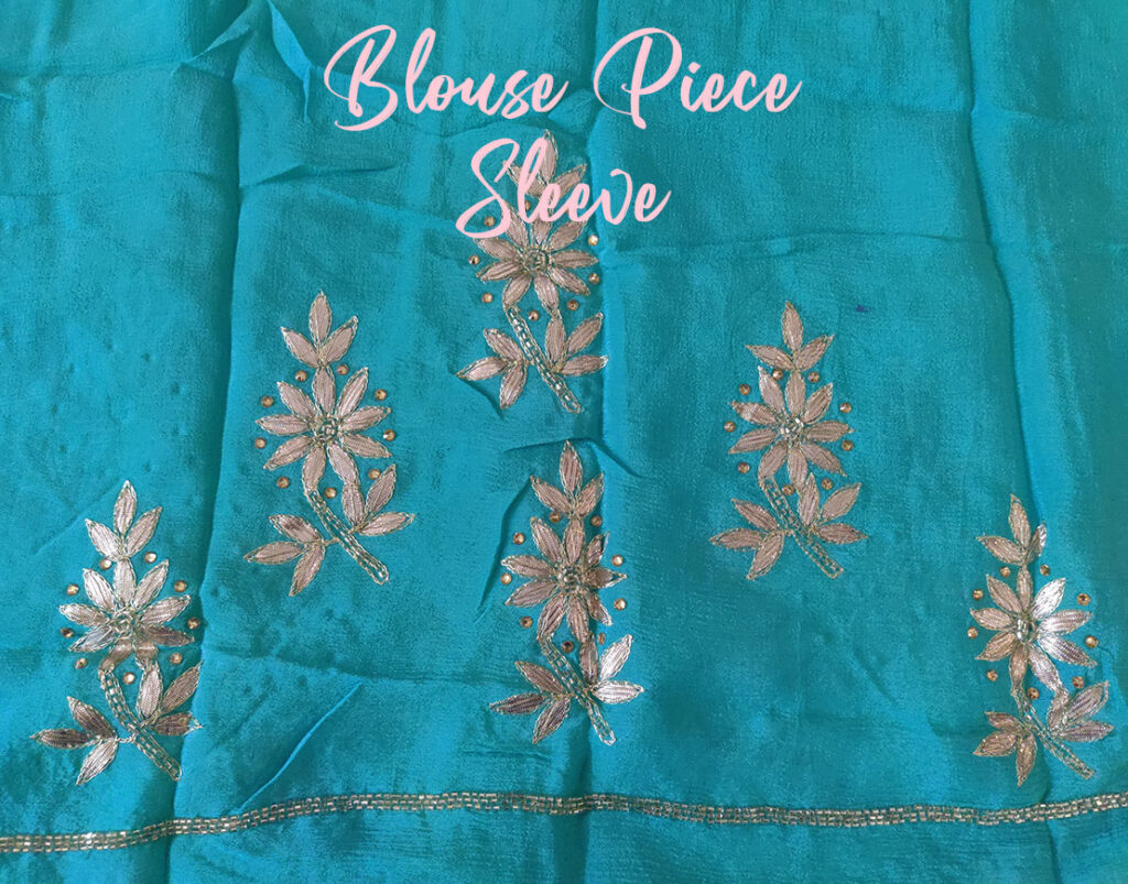 Bringing a breathtaking Green Blue Shaded Chinon Crepe Gota Patti Work Saree in a fabulous pattern. The border has a fabulous setting of zardozi and gota pattis. Thus a lot of hard work went into making this masterpiece. Additionally the color is simply superb. Also the blouse piece is in same color with work on the back and sleeves.