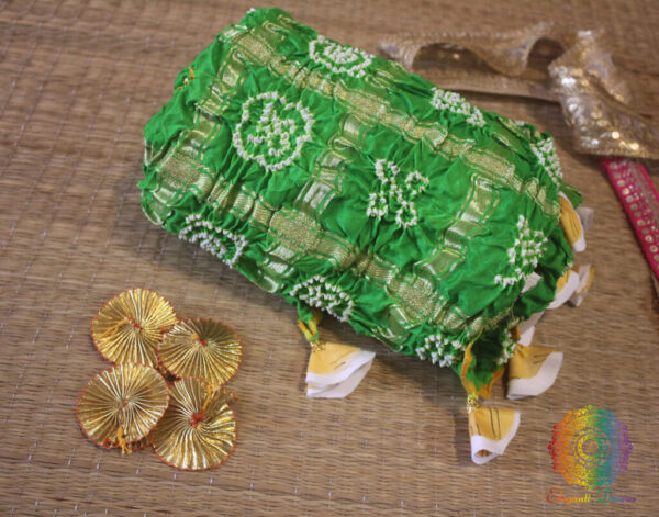 A Lovely Handworked Green Pure Gaji Silk Bandhani Gharchola Dupatta. You can carry it on any outfit. Thus this dupatta is a must have in every women’s trousseau.