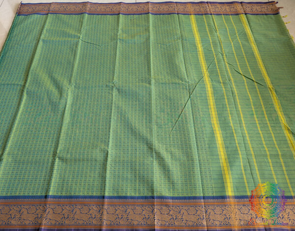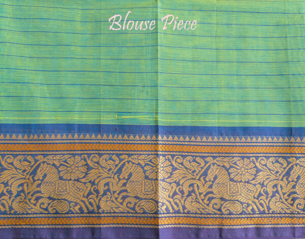 Woven from fine cotton yarns, the saree features a soft, breathable texture — perfect for long wear while maintaining a polished look. The intricate border detailing and subtle color palette make it ideal for cultural functions, office wear, or casual festive dressing.