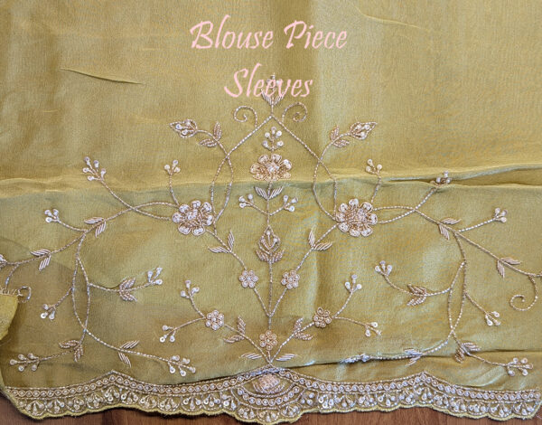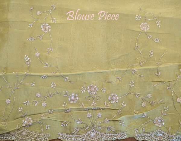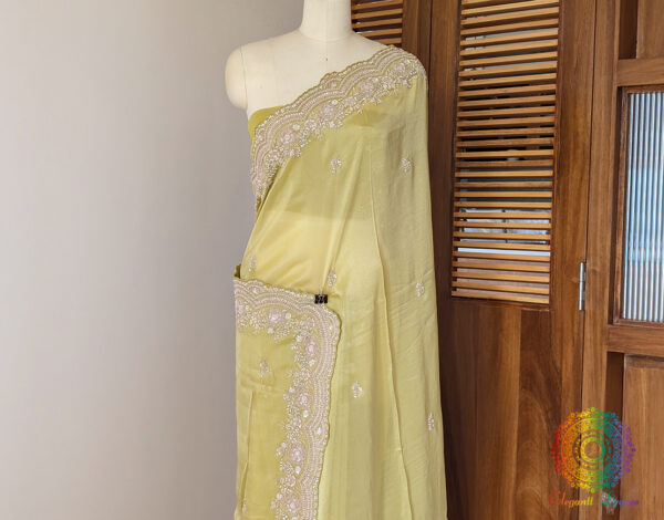 A beautiful Green Tissue Organza Zardozi Handwork Saree with work done on border and bootas all over the saree. The fabric is beautiful, making it a perfect choice for any occasion.
