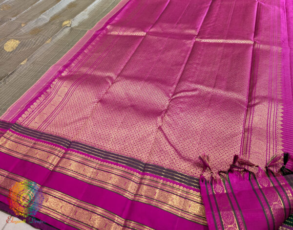 This gorgeous Grey Pure Kanjivaram Silk Saree with beautiful peacokc bootas all over the body. Also, the border has pretty peacock and elephant pattern in golden zari, while the pallu features a lovely geometrical pattern.