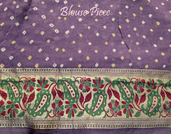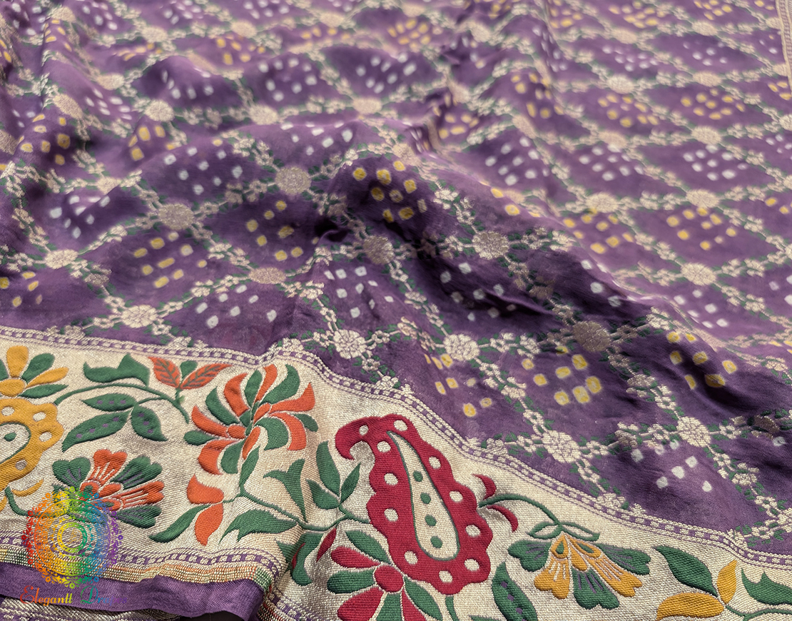 A spectacular Handwoven Lavender Pure Banarasi Georgette Meenakari Bandhani Saree with golden zari and resham weave. Its a fusion of karigari from Banaras and Kutch.