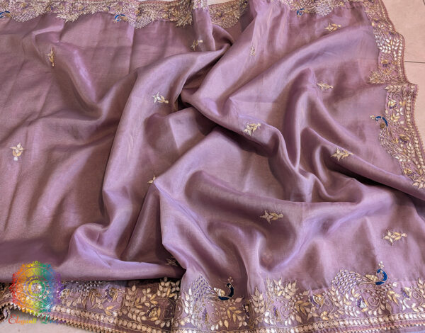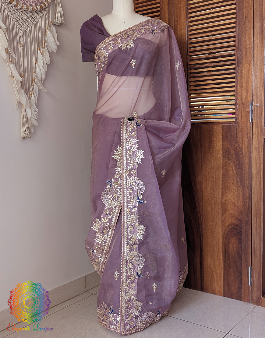 This Lavender Soft Tissue Organza is brought to life with exquisite gota patti handwork, featuring delicately crafted borders and elegant bootas scattered across the drape. Every stitch reflects skilled artistry, adding a regal touch to its refined charm.
