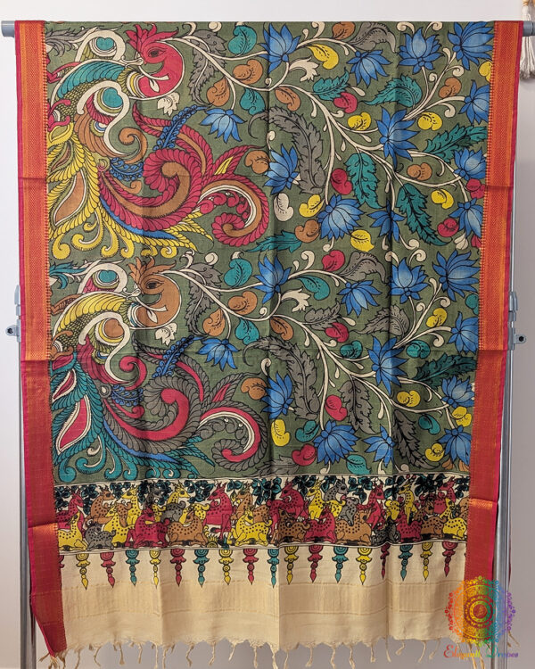 A masterpiece of art and elegance, this Kalamkari Dupatta crafted on Pure Bangalore Silk brings together timeless artistry and luxurious texture. Hand-painted using natural dyes, each piece narrates stories from Indian mythology and nature through intricate motifs and delicate brushwork.