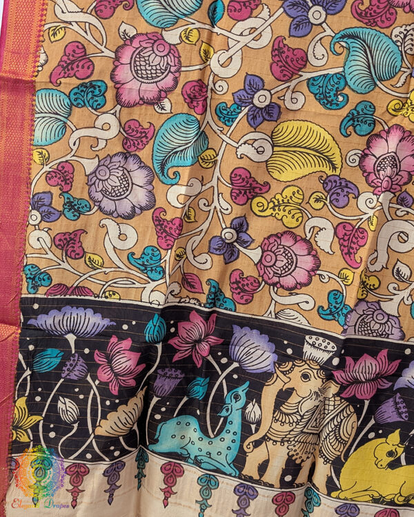 A masterpiece of art and elegance, this Kalamkari Dupatta crafted on Pure Bangalore Silk brings together timeless artistry and luxurious texture. Hand-painted using natural dyes, each piece narrates stories from Indian mythology and nature through intricate motifs and delicate brushwork.