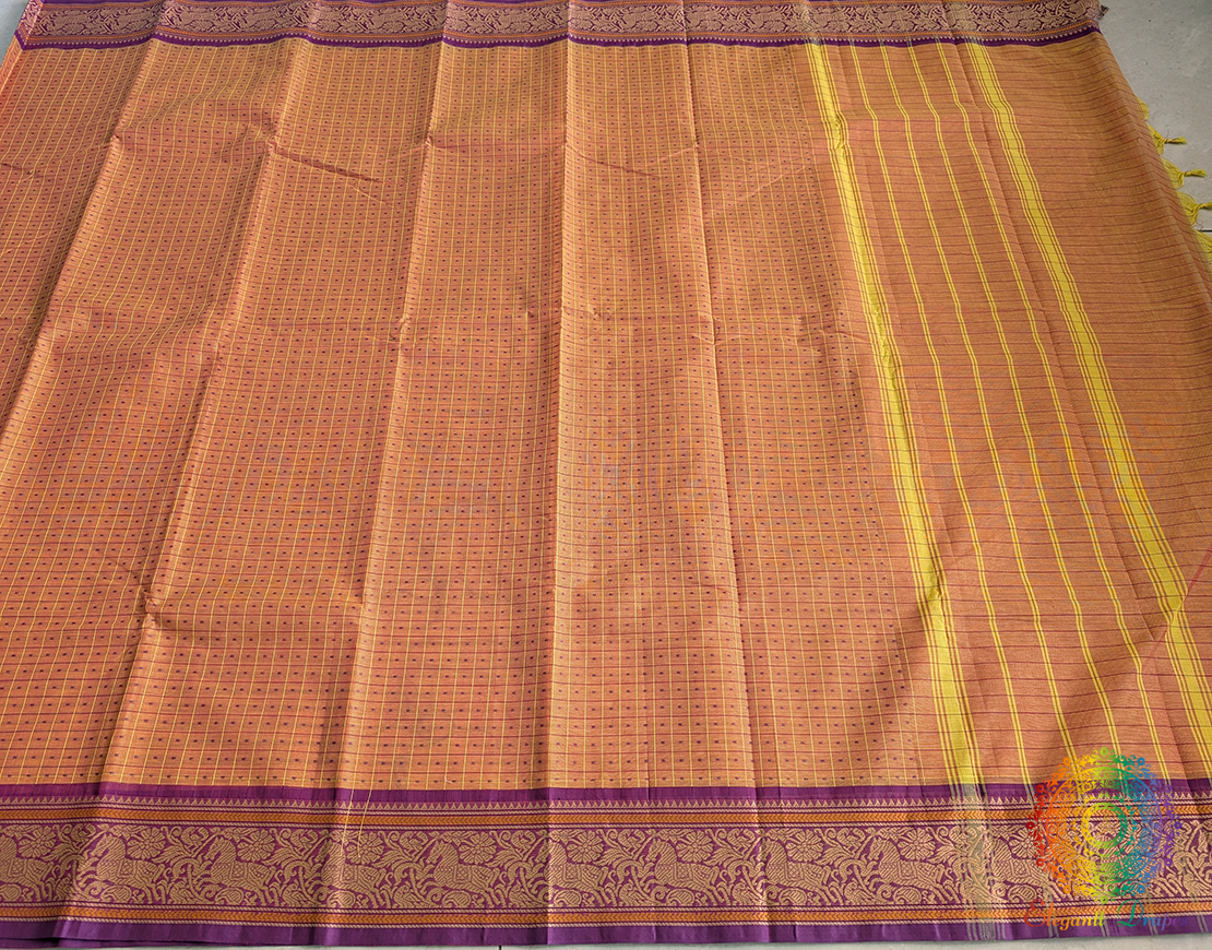 This Orange Pure Kanchi Cotton 1000 Boota Saree is handwoven in the heritage looms of Tamil Nadu, blending the beauty of simplicity with the richness of South Indian craftsmanship.