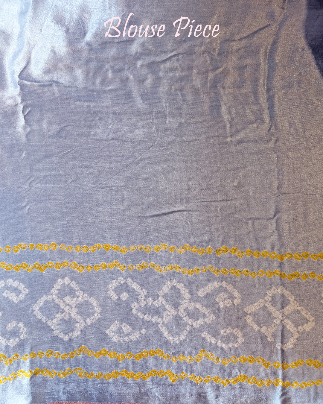 Here we have a Pale Grey Pure Gaji Silk Bandhani Gharchola Saree with Bandhej done all over the body, and Palla.  Moreover, the fabric is pure Gaji Silk giving the saree is lustrous and rich look. It’s a very light weight sarees and easy to drape. Surely the weaving and the tie and dye method of Kutch saree is unique and makes it stand out.