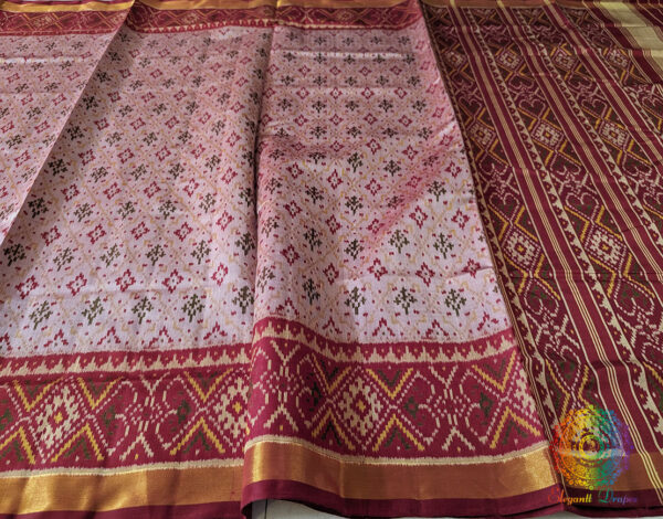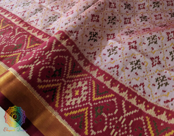 Here’s a gorgeous Handwoven Pale Pink Pure Mulberry Silk Rajkoti Patola Saree. The intricate pattern of this Patola saree make it a masterpiece. Moreover the fabric is pure mulberry silk.