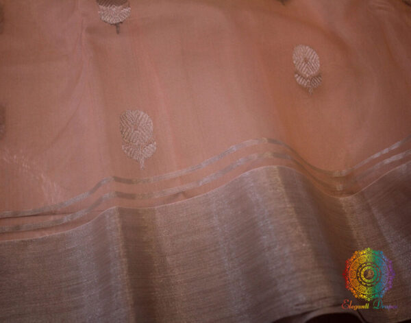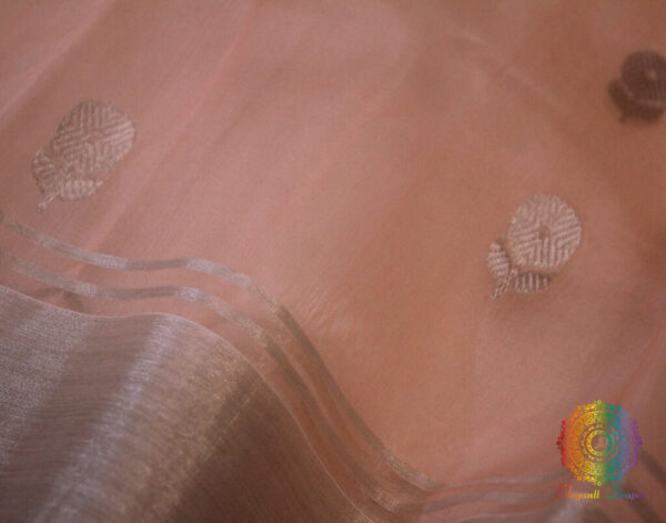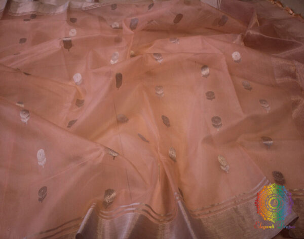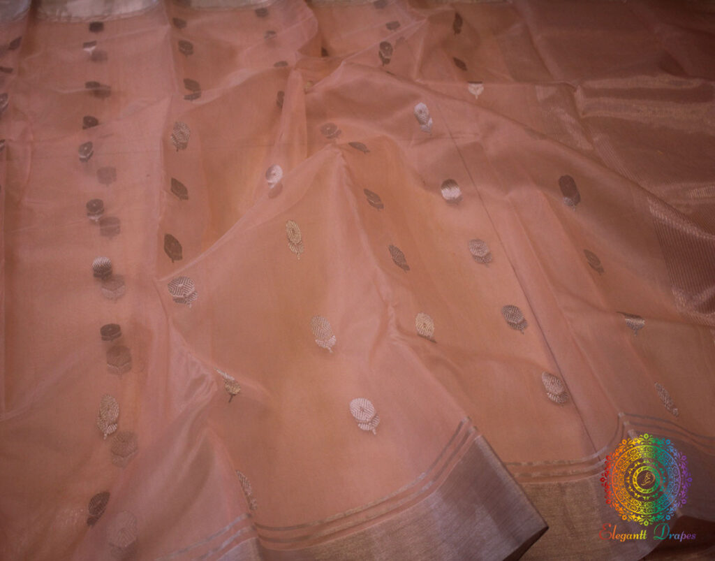 Here we have a Peach Pure Chanderi Handloom Katan Silk Saree with all over fine zari booties. Moreover the fabric is pure Chanderi katan silk with a very beautiful silver zari weave.
