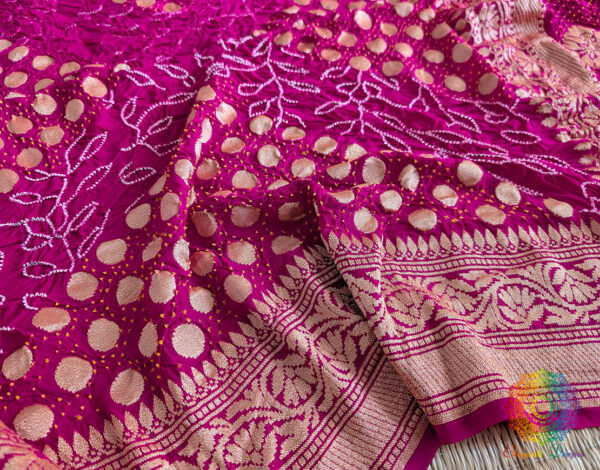 • Technique: Banarasi Zari Weaving & Rai Bandhej (Bareek Bandhani)