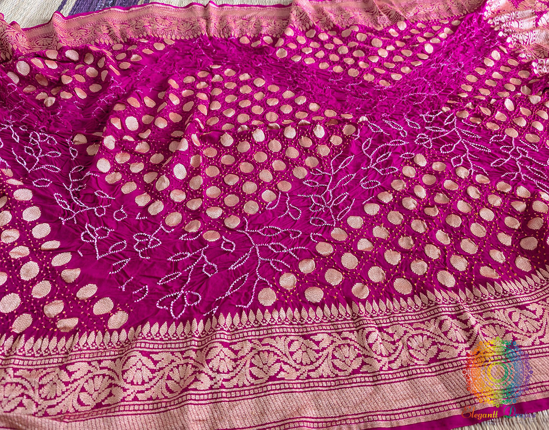 A stunning fusion of two legendary crafts — this Pink Banarasi Georgette Rai Bandhej Dupatta with bareek bandhani brings together the intricate zari weaving of Banaras and the delicate Bandhani tie-dye from Gujarat.