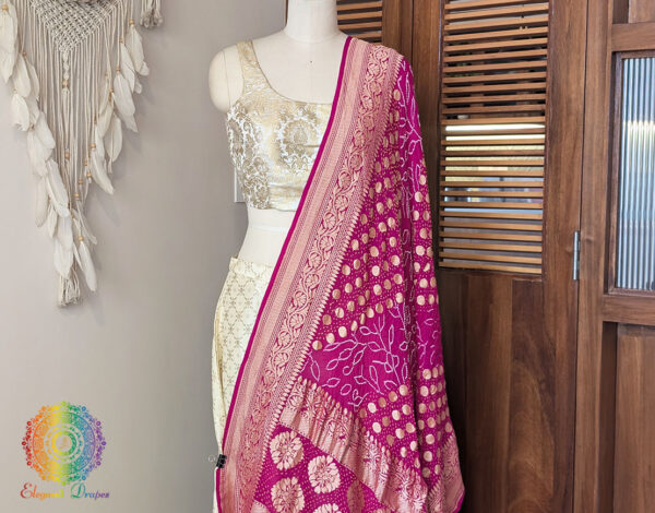 The dupatta is first handwoven in Banaras with rich zari motifs, and then sent to Gujarat where skilled artisans meticulously tie thousands of tiny knots to create Bareek (fine) Bandhej patterns, using the traditional Rai Bandhej technique. This entire process takes several weeks to months, making each piece a labor of love and heritage.