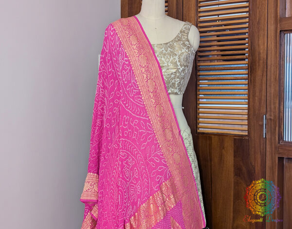 A Lovely Handwoven Pink Banarasi Georgette Rai Bandhej Dupatta in Bareek Bandhej. Its a fusion of karigari from Banaras and Gujarat.
