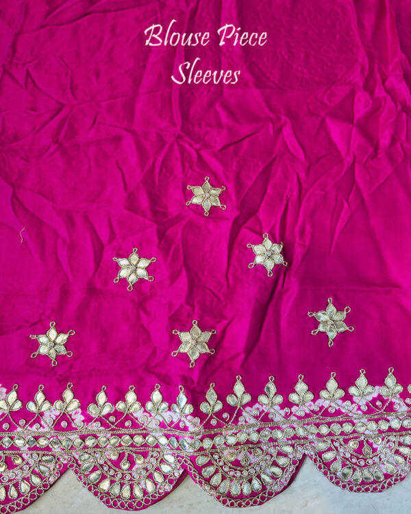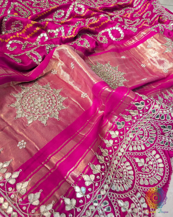 This Pink Bandhej Gharchola Gota Patti Saree brings together two traditional crafts from India. The saree features Bandhej from Gujarat and Gota Patti embroidery from Rajasthan. Each part is created by skilled artisans, and each detail reflects patience, care, and heritage.
