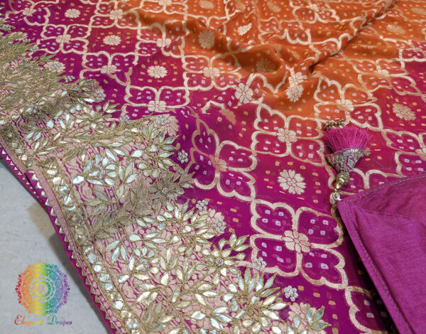 A Lovely Pink Orange Banarasi Georgette Bandhani Gota Patti Saree in Gharchola Pattern. The saree is adorned with intricate gota patti handwork which makes it all the more a perfect choice for occasion wear. Its a fusion of karigari from Banaras, Gujarat and Rajasthan. We must say, a truely heirloom piece.