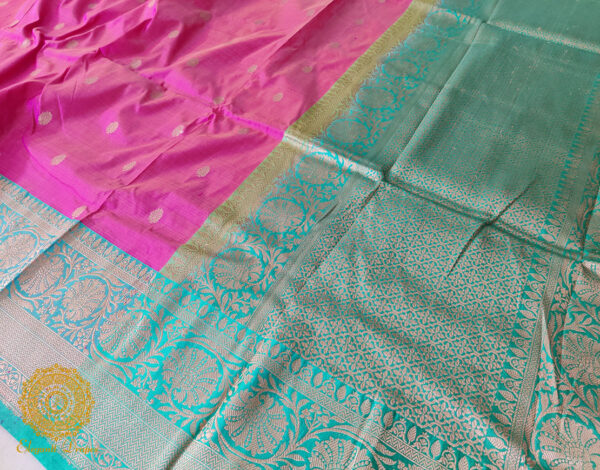 A heirloom of Banaras – Katan Silk Saree. These are handloom sarees which takes 2-3 weavers and more than a month to weave a single saree. Furthermore the motifs are inspired my the Mughal era.