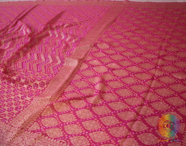 A Lovely Pink Pure Banarasi Khaddi Georgette Bandhani Saree in Gharchola Pattern. Its a fusion of karigari from Banaras and Gujarat.