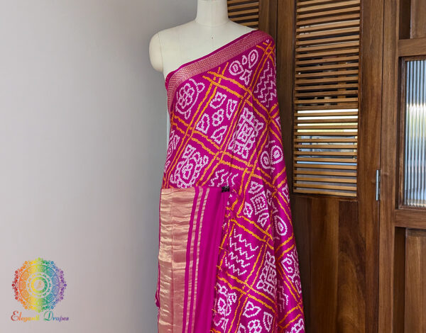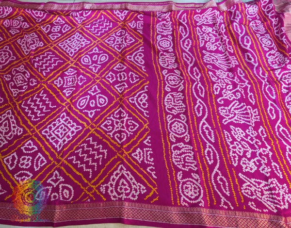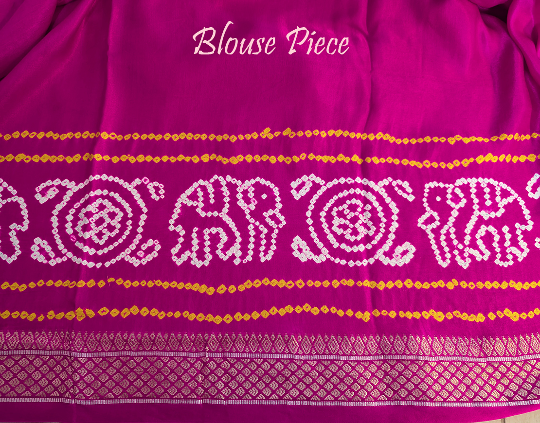 Here we have a gorgeous Pink Pure Gajji Silk Bandhani Saree with Bandhej done on the Palla and Border.  Moreover, the fabric is pure Gajji Silk giving the saree is lustrous and rich look. Its a very light weight sarees and easy to drape. Surely the weaving and the tie and dye method of Kutch saree is unique and makes it stand out.