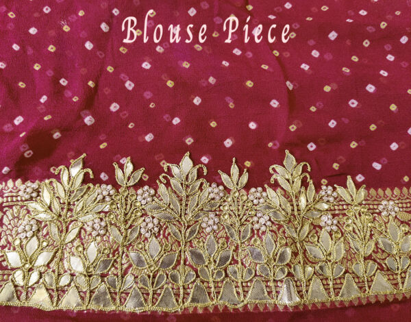 A Lovely Plum Pure Banarasi Georgette Bandhani Gota Saree in Gharchola Pattern. The saree is adorned with intricate gota patti handwork which makes it all the more a perfect choice for occasion wear. Its a fusion of karigari from Banaras, Gujarat and Rajasthan. We must say, a truely heirloom piece.