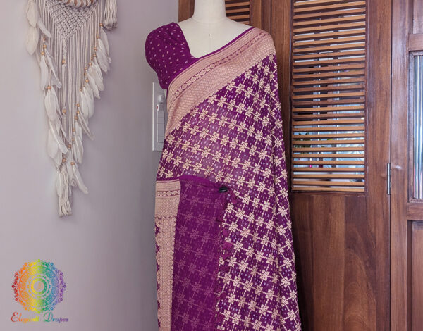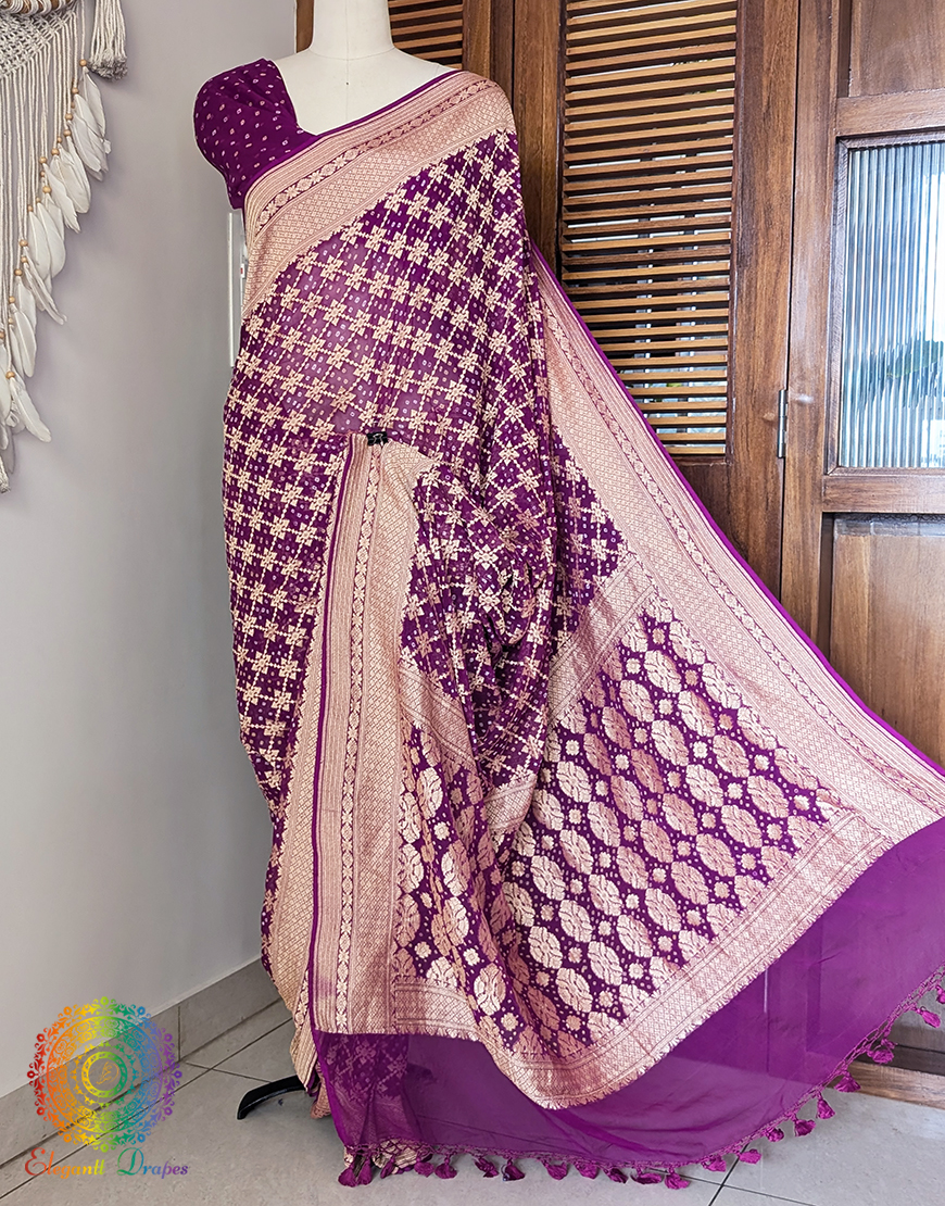 A Lovely Purple Banarasi Bandhani Khaddi Georgette Saree in a beautiful pattern. Its a fusion of karigari from Banaras and Gujarat.