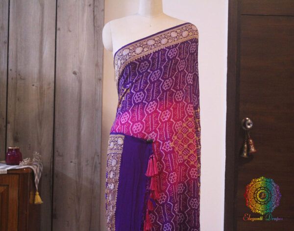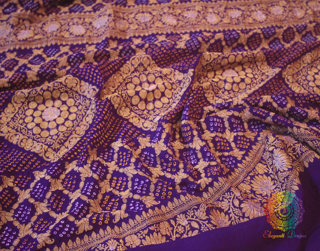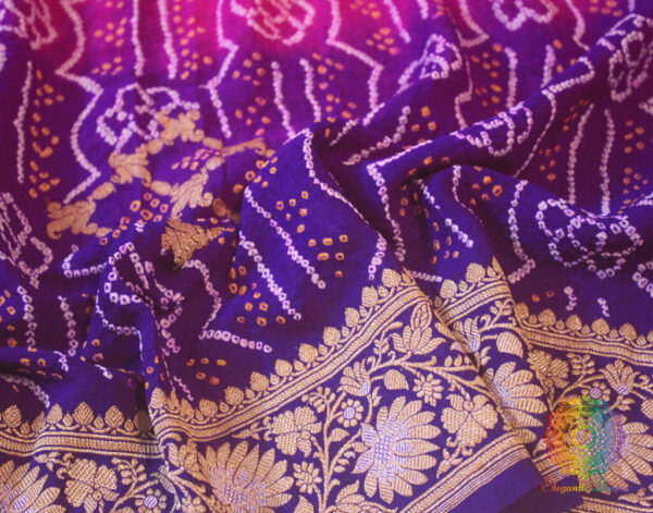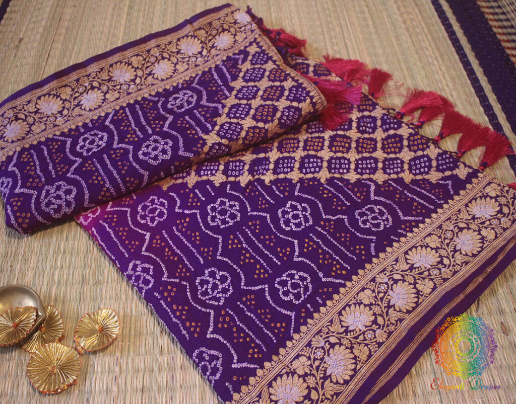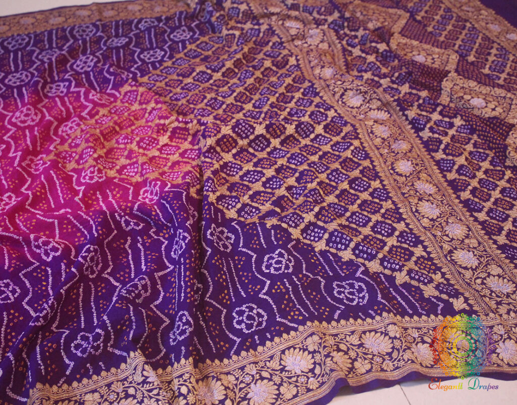 A spectacular Handwoven Purple Pink Pure Banarasi Khaddi Georgette Rai Bandhej Saree with silver & golden zari weave. Its a fusion of karigari from Banaras and Kutch.
