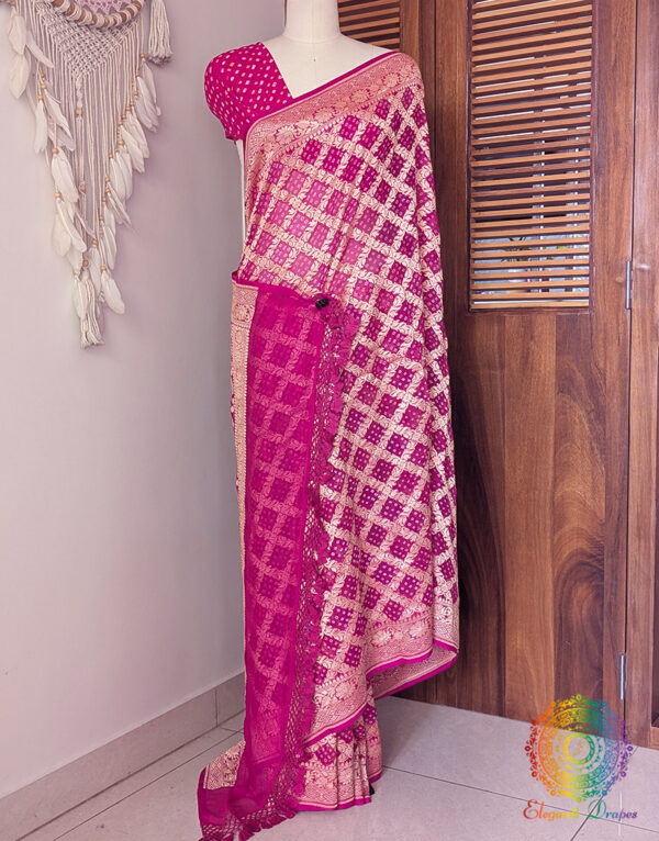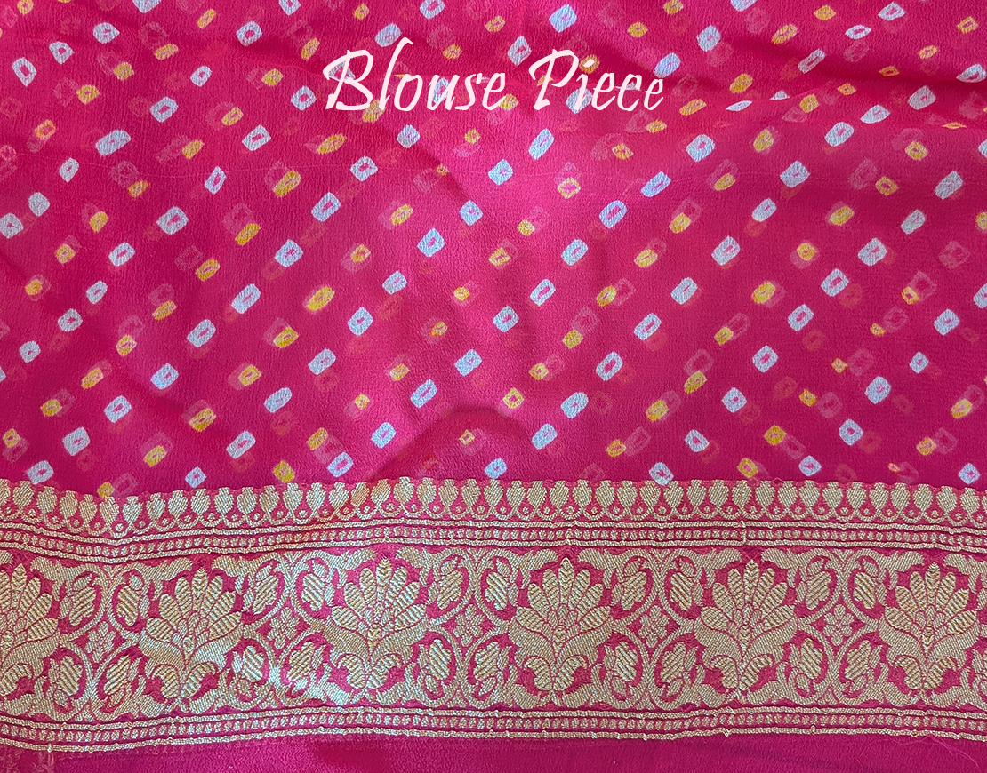 A Lovely Rani Pink Banarasi Bandhani Khaddi Georgette Saree in a beautiful pattern. Its a fusion of karigari from Banaras and Gujarat.
