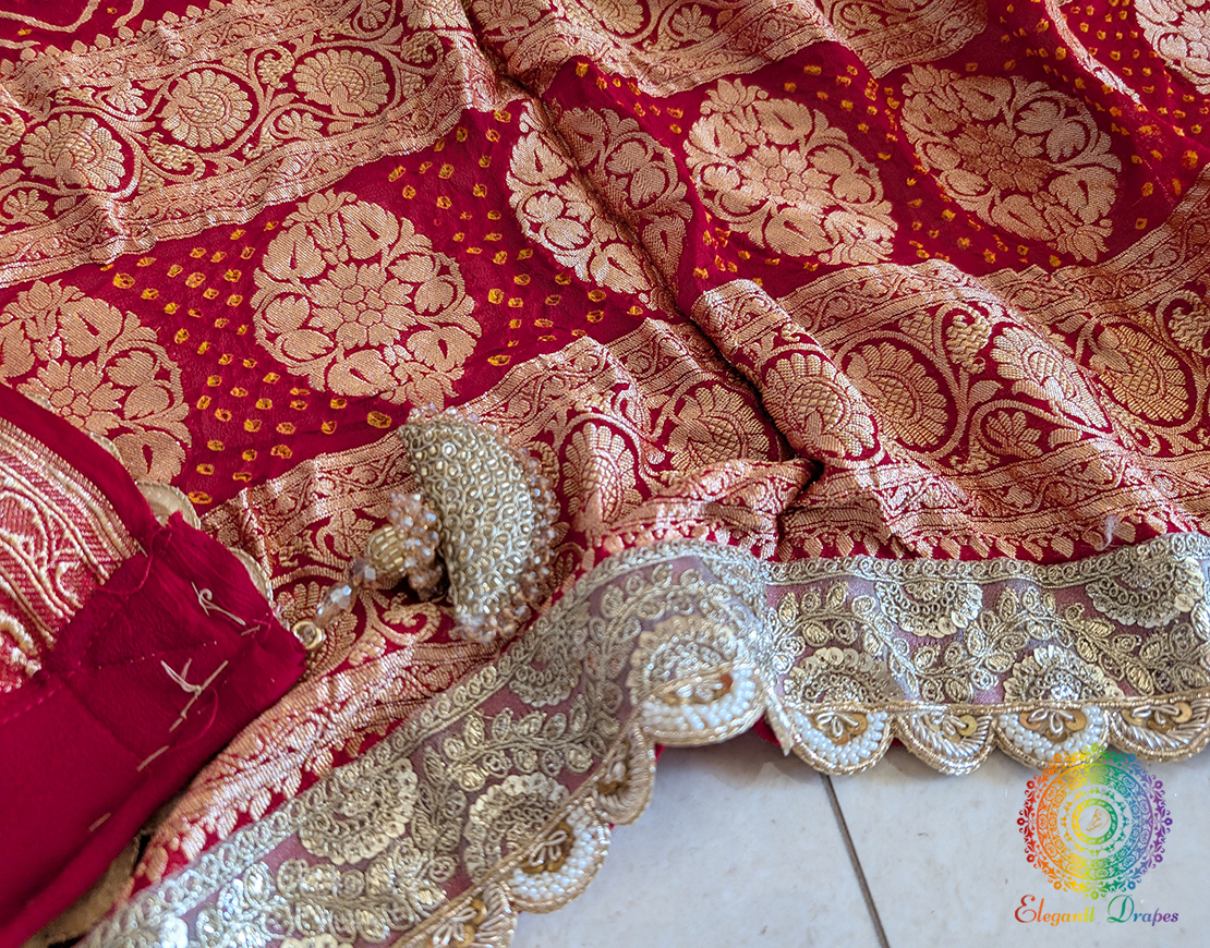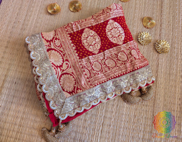 A Lovely Handwoven Red Banarasi Georgette Bandhani Border Dupatta in Gharchola Pattern. The dupatta is adorned with beautiful marodi and zardozi work laces on the border.