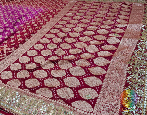 The zari work on the saree is done in Banaras and then the Bandhej is tye and dyed in Gujarat. Then the karigars of Rajasthan have worked their magic with the gota embroidery. So its takes about a couple of months for a single saree to be ready.
