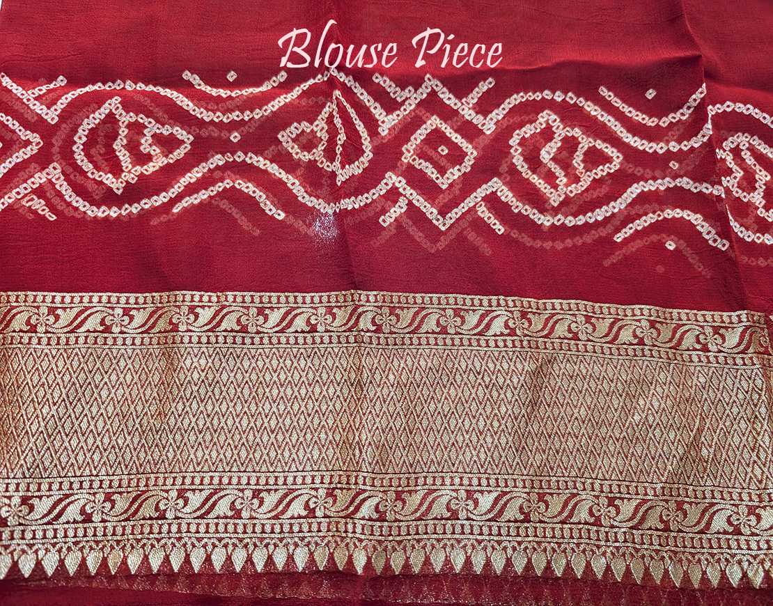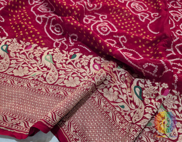 A spectacular Handwoven Red Pure Banarasi Georgette Meenakari Bandhani Saree with golden zari and resham weave. Its a fusion of karigari from Banaras and Kutch.