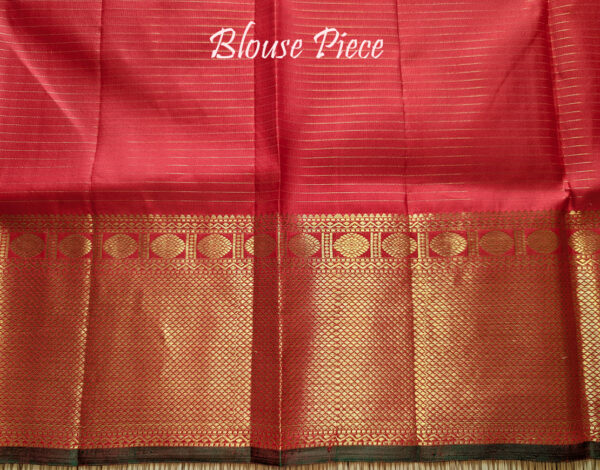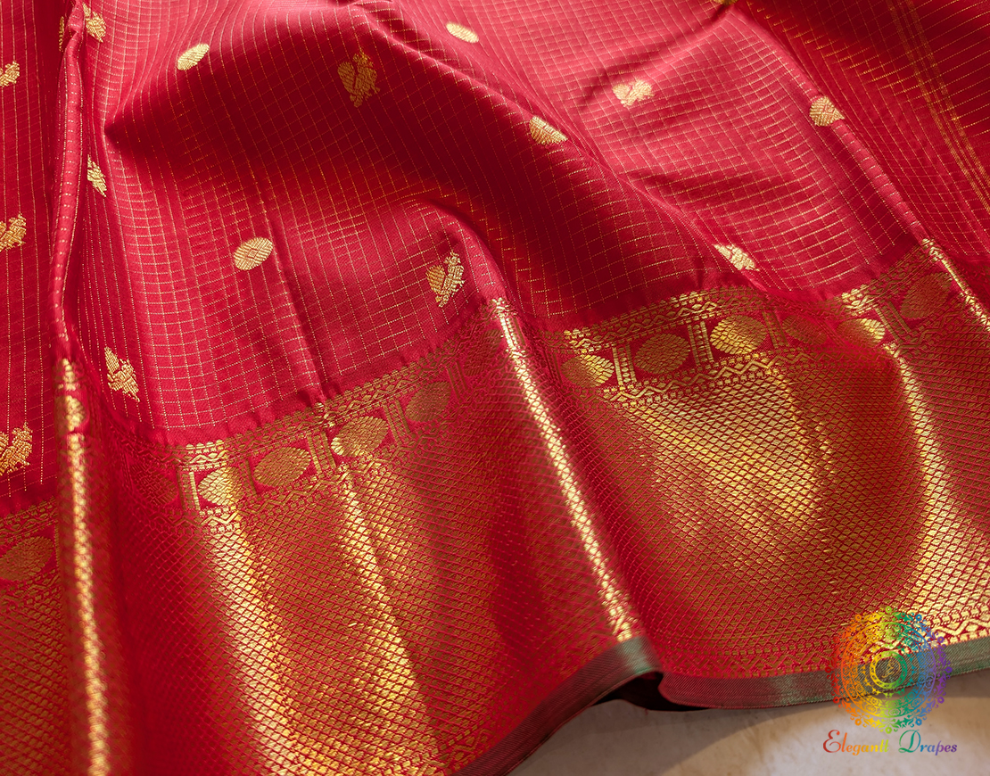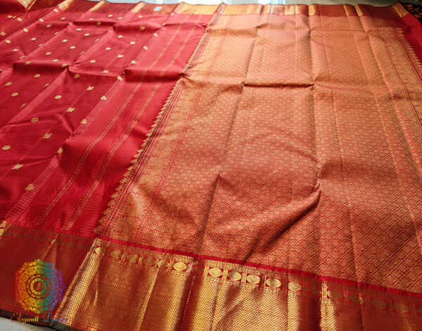 This lovely Red Pure Kanjivaram Handloom Silk Saree with beautiful round and peacock booties in golden zari all over the body. Also, the border has geometrical pattern, while the pallu contains peacocks.