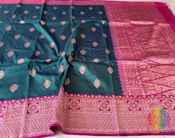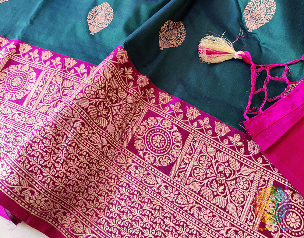 A heirloom of Banaras – Katan Silk Saree. These are handloom sarees which takes 2-3 weavers and more than a month to weave a single saree. Furthermore the motifs are inspired my the Mughal era.
